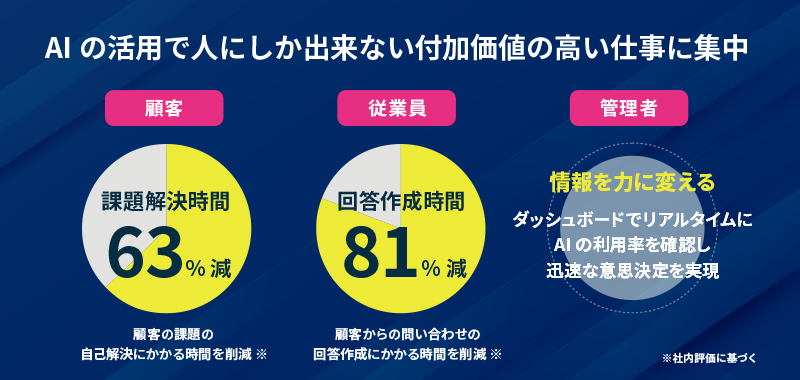 AI Search顧客がポータルから質問を検索すると、検索された内容をもとにAIがナレッジ情報から最適な回答を生成します。顧客が解決策を見つける手間が減るため”自己解決率が向上”し“顧客満足度の上昇”につながります。