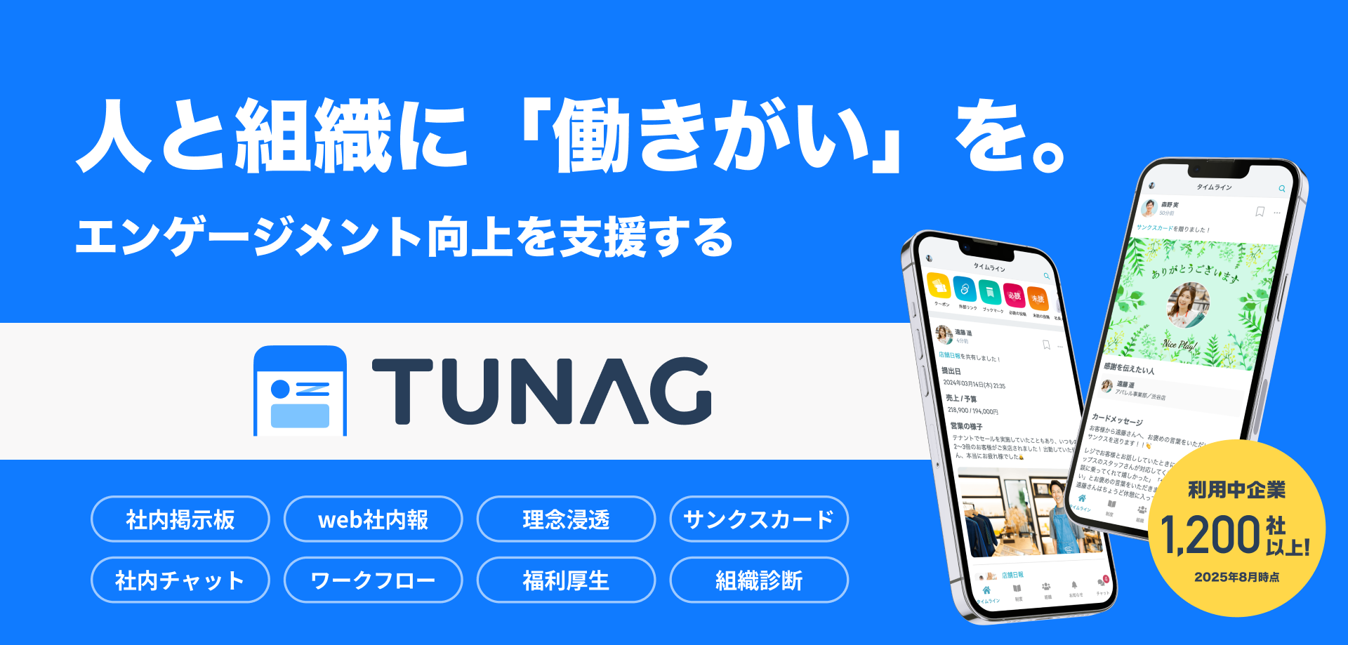 TUNAG(ツナグ)は、組織の生産性向上や離職率の低下を目的とし、社内コミュニケーションと情報共有を促進する統合型プラットフォームです。2025年8月時点で、導入企業数は1,200社、利用ユーザー数は140万人を突破しています。