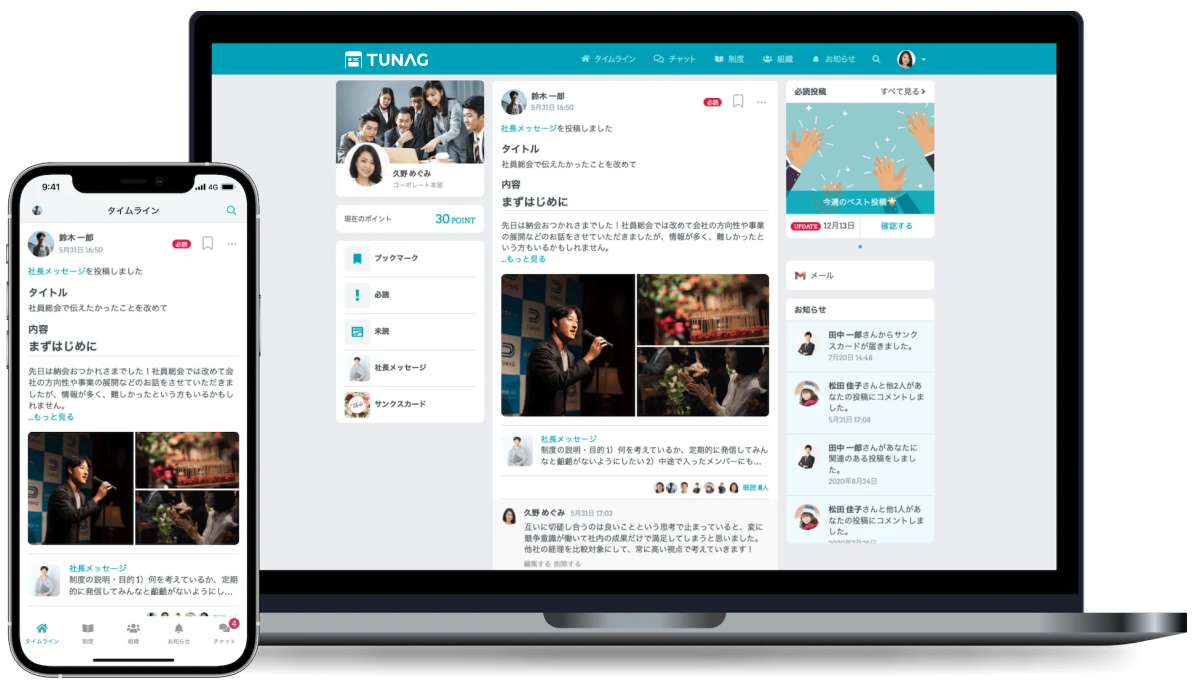 会社からのお知らせ / WEB社内報 / 社長メッセージ / サンクスメッセージ / 1on1 / 日報 / 社内ポイント / 社員プロフィール・自己紹介 / 社内表彰 / 研修・マニュアル / 社内教育用テスト / 組織診断 etc…
