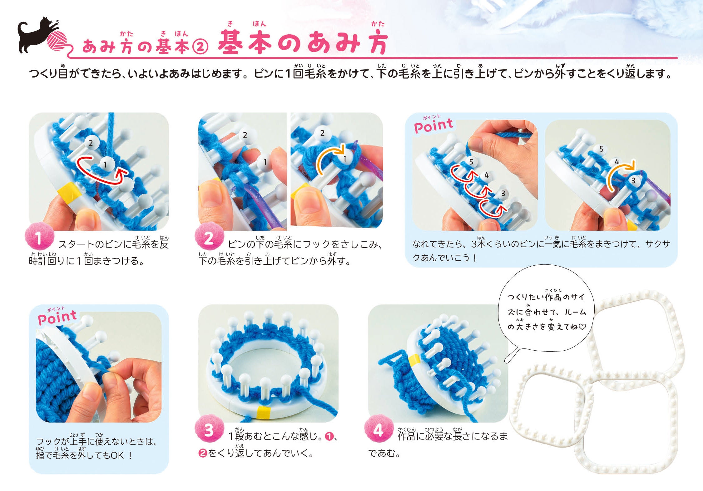 編み物ブームにのって、子どもが編み物に初挑戦したけど、なかなか難しく、あきらめた……というスタッフママたちの声から、ハンドメイドキットシリーズ「ガールズクラフト」に、編み機の「ニッティングルーム」が登場しました! リリアン編みのような編み方なので、かぎ針や棒針にくらべ簡単で、ハードルが低く、初心者でも帽子があっという間につくれます。編み機は、ブロックごとに取り外して、大きさを手軽に変更できるので、子どもから大人まで、さまざまなサイズの帽子がつくれます。