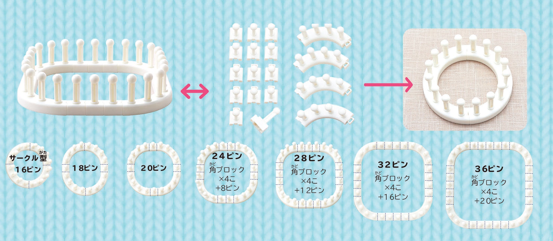ニッティングルームの最小サイズは16ピンのサークル型。そこに2ピンずつピンブロックを足していけるので大きさの微調整ができ、最大36ピンまで大きくすることができます。これひとつで、いろいろなサイズの帽子やポシェットが作れる優れものです。