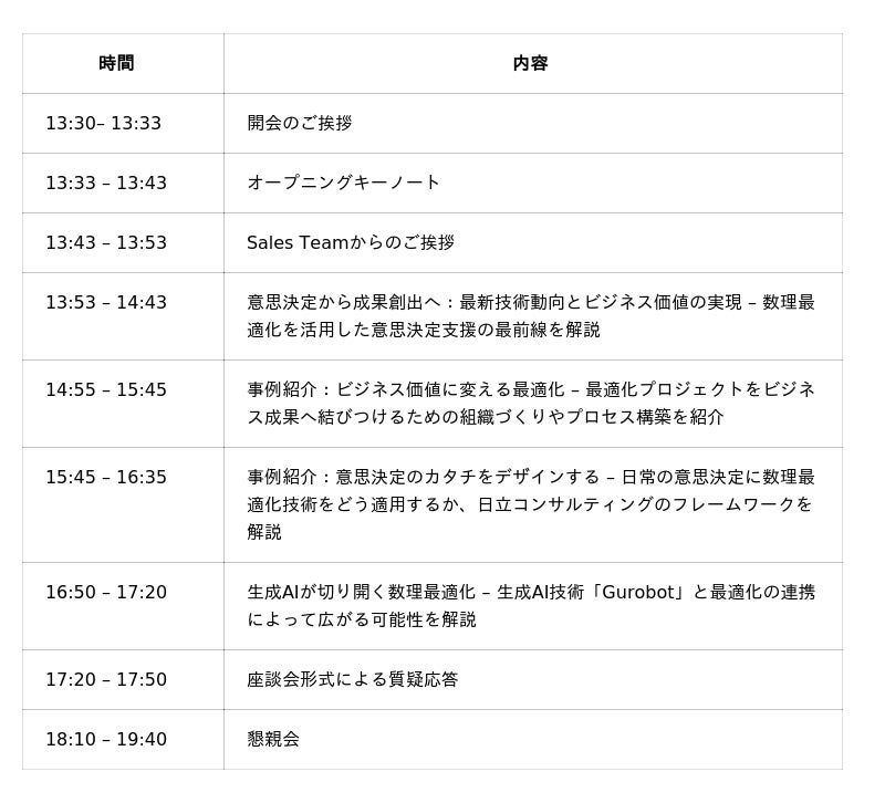 - 最新技術と事例を1日で学習: Gurobiのテクニカルエキスパートによる最新動向の解説と、グリッド・日立コンサルティングによる実践的な事例紹介を通じて、数理最適化プロジェクトを成功に導くヒントが得られます。- 生成AIとの連携を体感 :弊社が開発中の生成AI「Gurobot」を紹介し、最適化プロセスを自動化・支援する最新の取り組みをお伝えします。