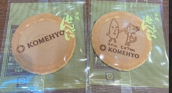 ご来店いただき、商品をご購入いただいた方には、コメ兵のオリジナルキャラクター、コメくんとヒョウちゃんがプリントされた朝日軒のせんべいをプレゼントします(先着2,000名様)