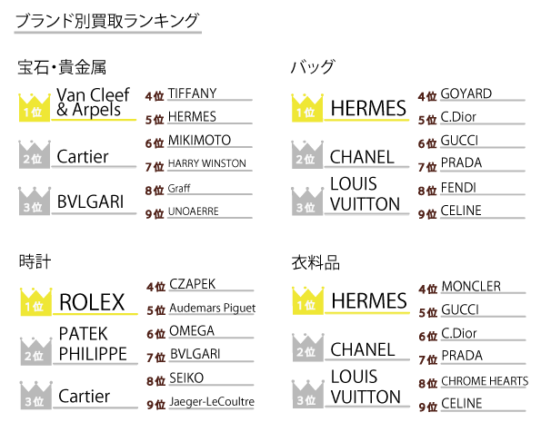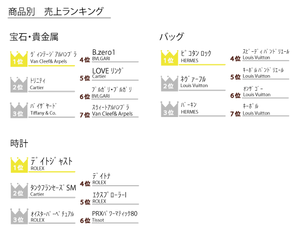 買取も販売も、一位、二位、三位のエルメス、シャネル、ルイヴィトンは言わずとしれたフランスの三大ブランド。世界的な流通量から考えると、ルイヴィトンが圧倒的に多いが、それを抑えて買取も販売も、エルメスが上位に。なお、バーキン、ケリーをおさえ上期に販売で人気だったのがエルメスのピコタンロック。