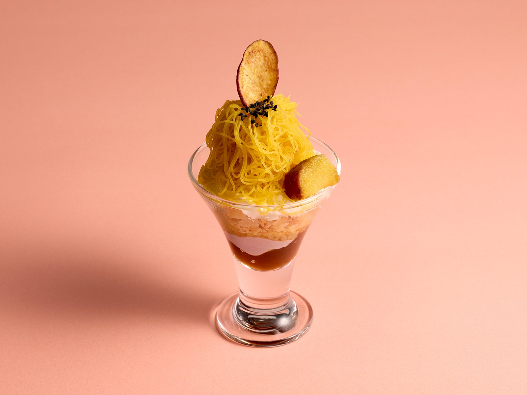 おいものモンブランをトッピングした、ミニサイズながらも満足感のあるパフェです。ねっとり甘いおいものペーストは、ホイップやバニラアイス、“紅はるか”の焼きいもと相性抜群。サクサクとしたクラッシュパイが食感にアクセントを加えます。