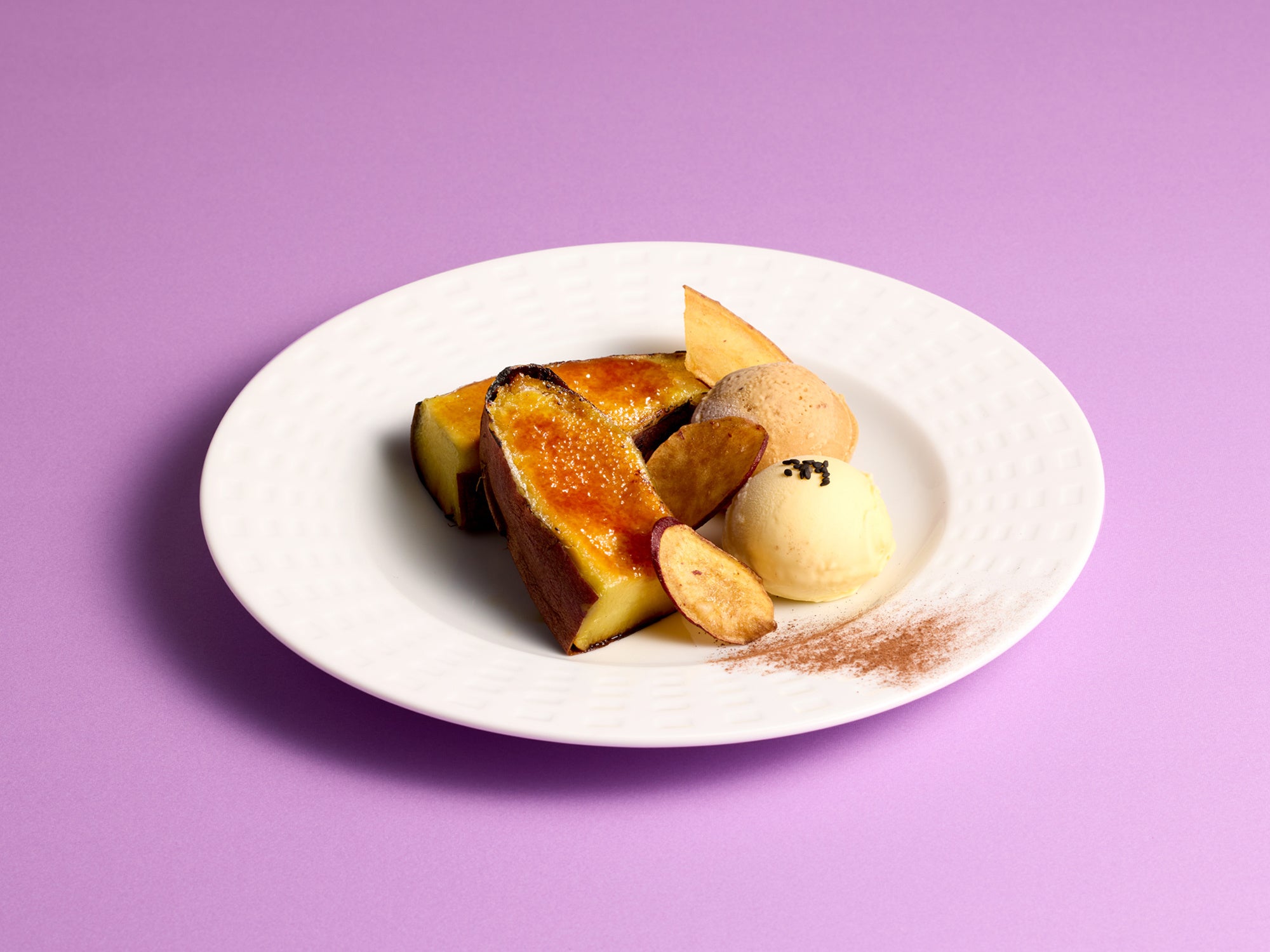 “紅はるか”の焼きいもは、お店でブリュレにすることで、おいものねっとりとした口当たりとブリュレのパリパリとした食感のコントラストが楽しめるように仕上げました。