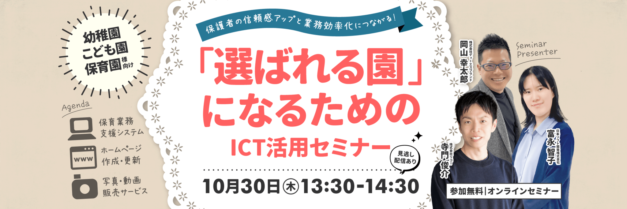 セミナー名:保護者の信頼感アップと業務効率化につながる!「選ばれる園」になるためのICT活用セミナー