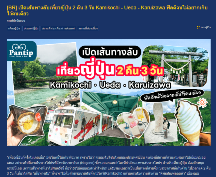 オーエイチが主導し、タイ最大級の口コミサイト「Pantip.com」にてプロモーション記事を公開しました。Pantip.comは旅行先選びの信頼度が最も高いメディアで、1日6,200,000PV、ユーザーは1日2,400,000人の方が見られています。