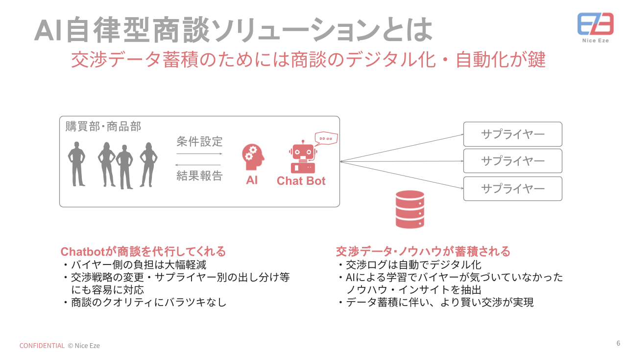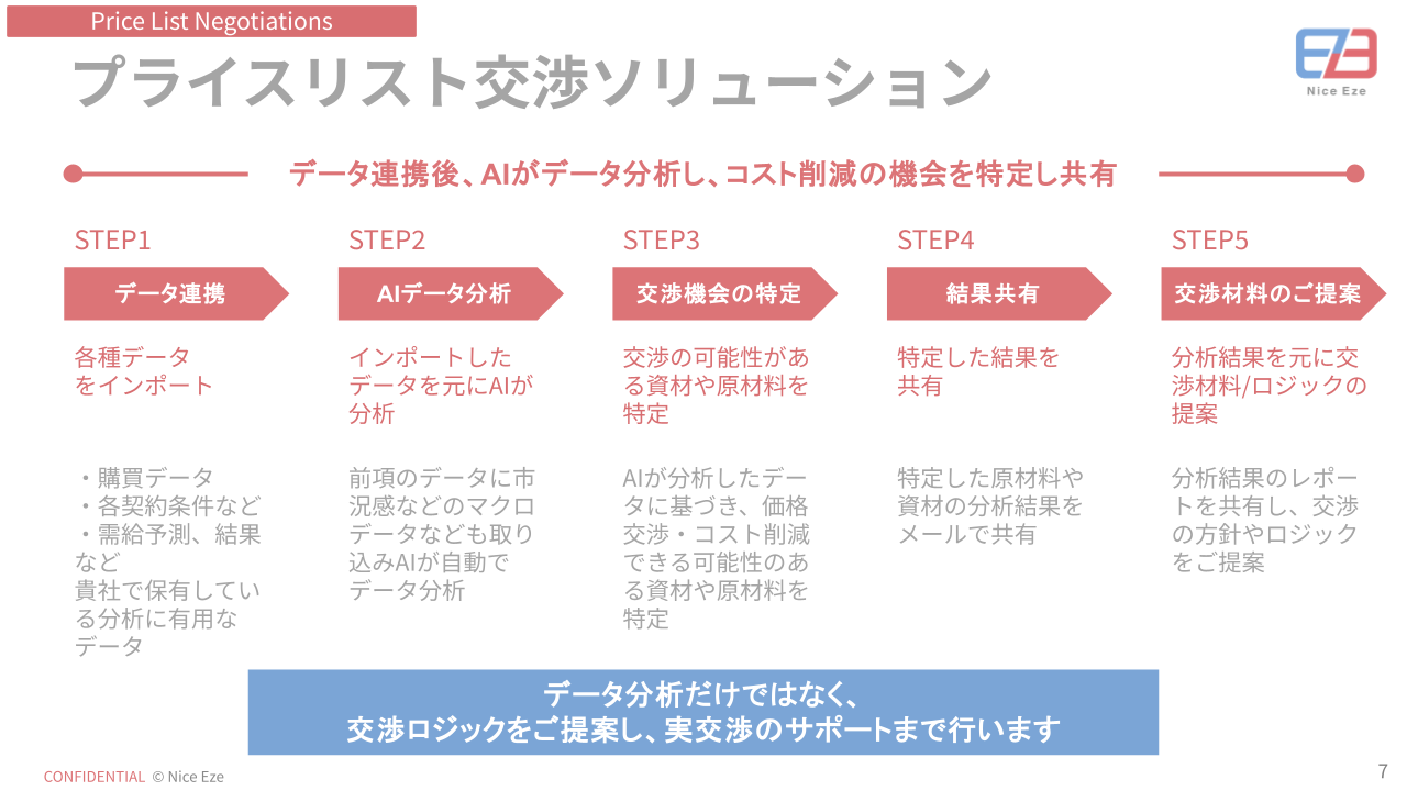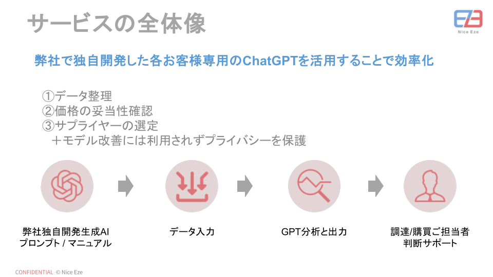 株式会社Nice Eze(本社:東京都港区、代表取締役:松浦学)は、AI及びLLM(大規模言語モデル)を活用し、購買・調達・仕入れ業務のDX(デジタルトランスフォーメーション)を支援する新サービスの提供を開始することをお知らせします。 本サービスは、過去の見積もりや図面といった埋もれがちなデータをAIで整理・活用可能にすることで、見積もり査定や発注業務を大幅に効率化し、コストの適正化を実現します。サービスの中核ソリューションとして、当社が国内総販売代理店を務める自動交渉AI「Pactum(パクタム)」も提供。新機能も追加され、学習能力が一層高まり、科学的でフェアな商談能力が一層高まりました。これらのサービス開始に伴い、トライアルユーザーの募集を開始いたします。