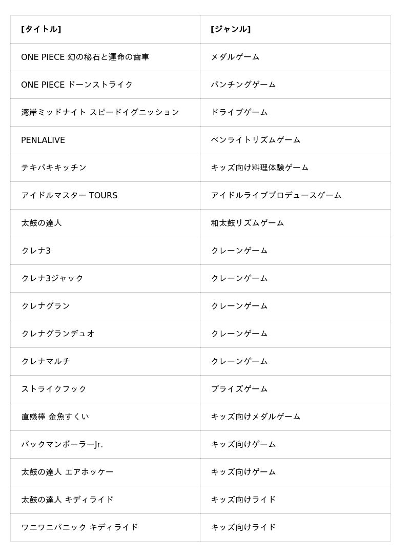 そのほか、パンチングゲーム「ONE PIECE ドーンストライク」、新作リズムゲーム「PENLALIVE(ペンラライブ)」、キッズ向け料理体験ゲーム「テキパキキッチン」など、幅広い年齢層のユーザーにむけた個性豊かなラインアップで出展します。