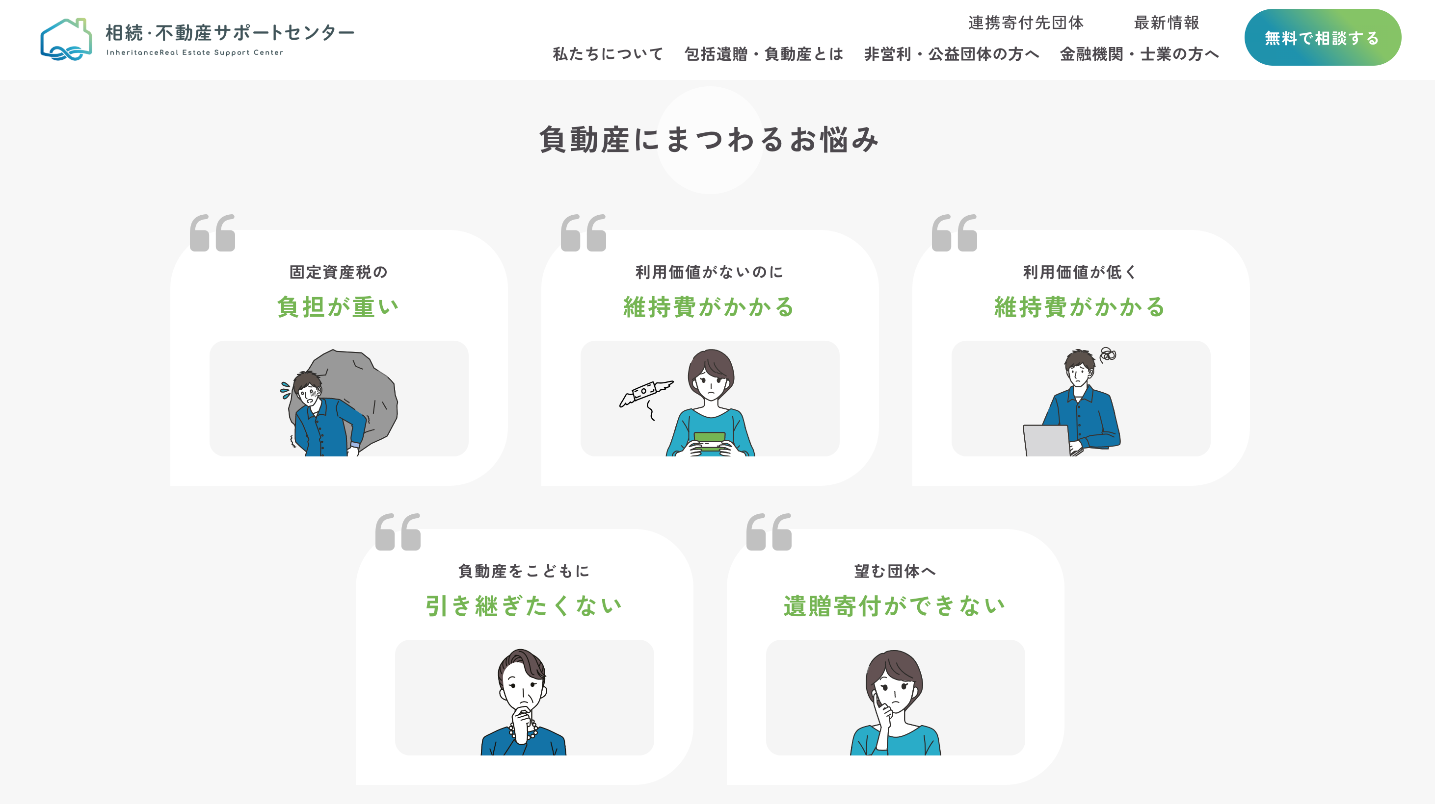 活用が難しい、需要が少ないなどの理由により売却などが困難な不動産「負動産(まけどうさん)」を持つ方も、安心してNancyへ遺贈寄付のご相談をいただけるようになります。