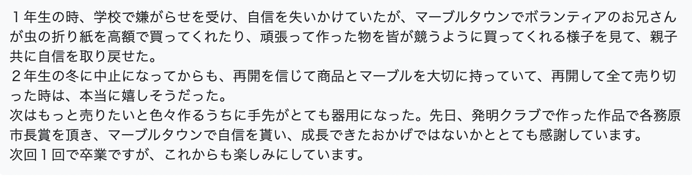 第10回ぎふマーブルタウン2023秋参加者のお家の方から、アンケートフォームへいただいたメッセージです。