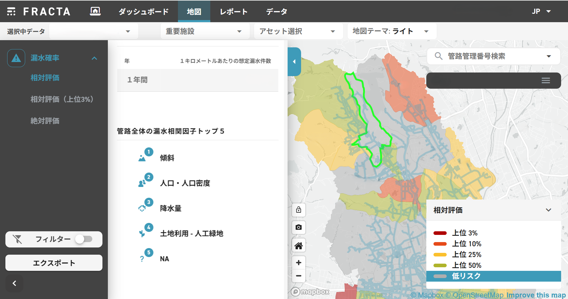 インフラ老朽化の社会課題に対して、AI技術を用いて評価した地下埋設配管の“劣化度を可視化”するサービスをメインに提供するFracta Japan株式会社(本社:東京都中野区、代表取締役:的場雄介)は、精緻かつ説明性の高いアセットマネジメント計画策定に活用可能な「更新基準年数シミュレーション」と、漏水調査を最適化する「漏水調査マップ」を新たに実装した。