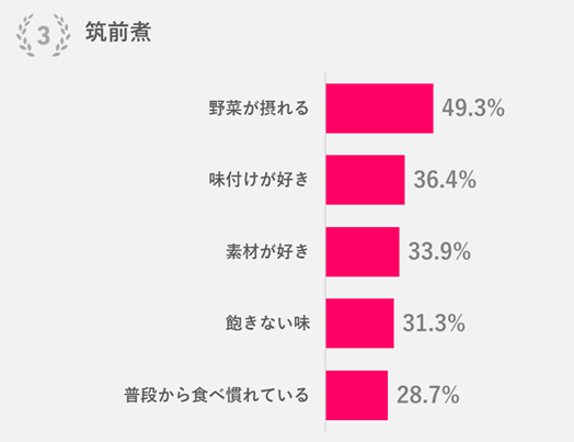 3位は「筑前煮」。60代と70代以上で3位だった。好きな理由の1位は「野菜が摂れる」、2位は「味付けが好き」、3位は「素材が好き」。