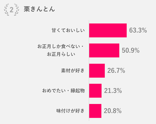 2位は「栗きんとん」。すべての年代で2位だった。好きな理由の1位は黒豆と同様「甘くておいしい」、2位は「お正月しか食べない・お正月らしい」、3位は「素材(栗)が好き」。