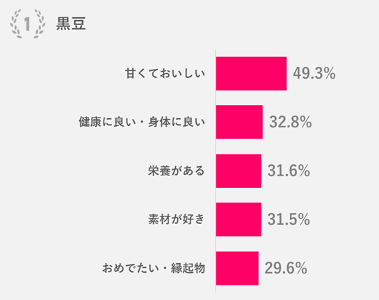 「好きなおせち料理」の1位は「黒豆」。すべての年代で1位だった。好きな理由の1位は「甘くておいしい」、2位は「健康に良い・身体に良い」、3位は「栄養がある」。