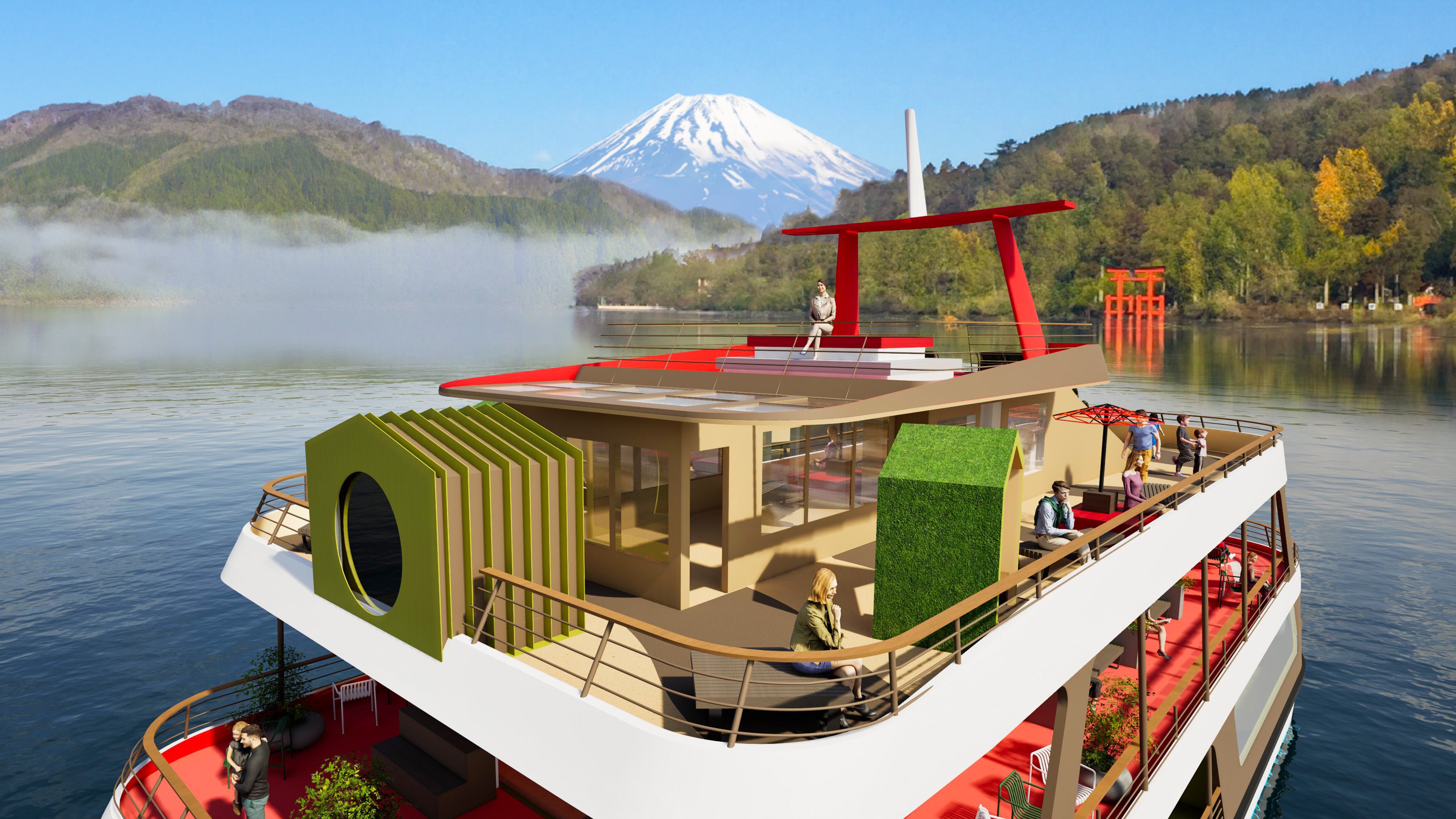船内には、煌めく「黄金茶室」、提灯をモチーフにした柔らかな光が幻想的なムードを醸し出すゾーン、そして茶畑を想起させる開放的な屋外ベンチなど、趣向の異なる多彩なシーンをご用意し、お客さまをお迎えいたします。季節ごとに表情を変える芦ノ湖の景観を背景に、まるで茶室を巡るように船内を回遊しながら、お茶の奥深さや新たな発見、そして思いがけない出会いを心ゆくまでご堪能いただけます。