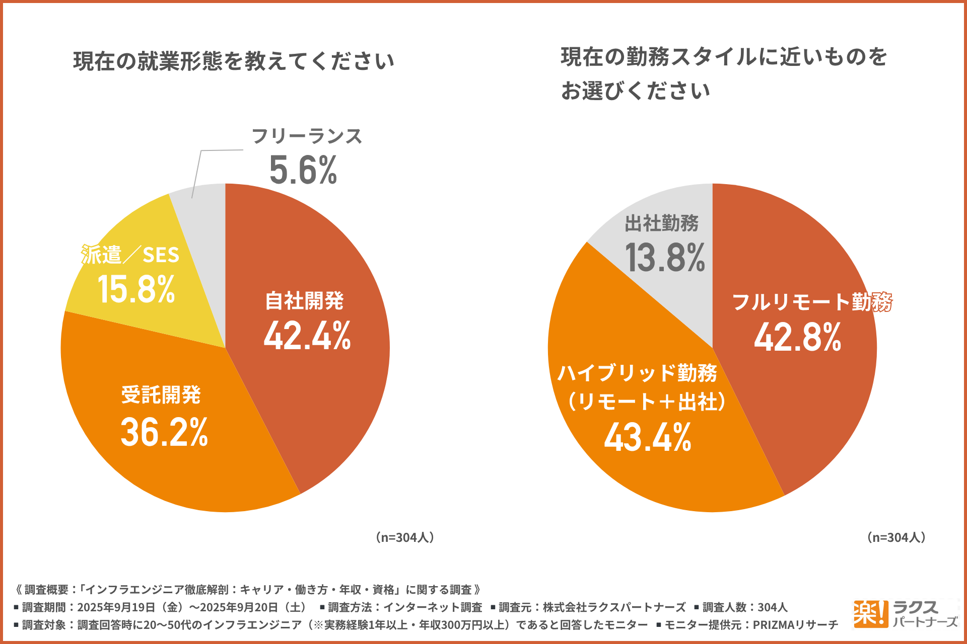 インフラエンジニアという職種の性質上、場所に縛られずに仕事ができる要素が強いことを示しています。出社のみという体制は少数にとどまっており、柔軟性のある働き方が業界基準になりつつあるようです。