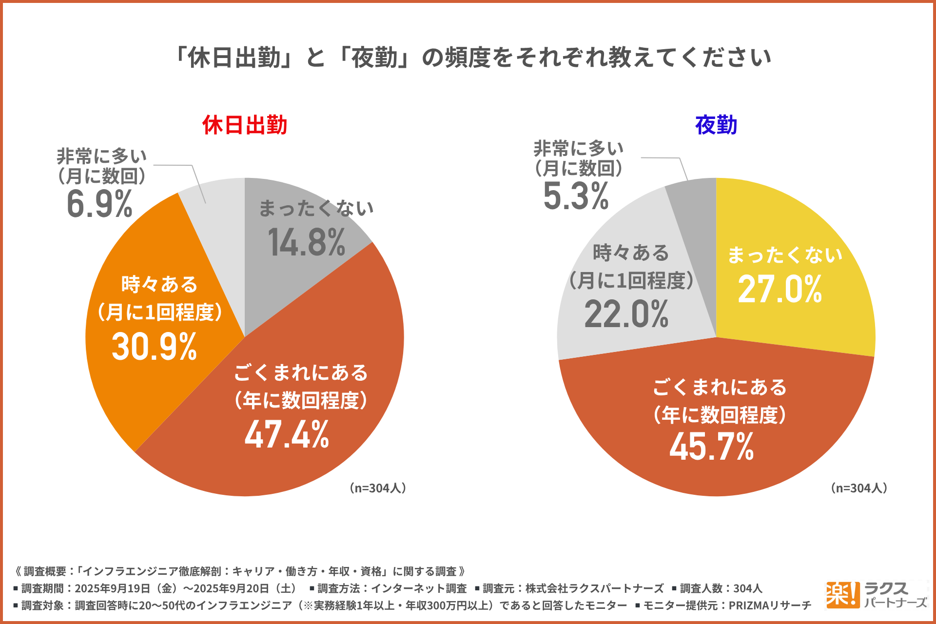 全体的に、休日出勤・夜勤のいずれも「ごくまれにある」が最多で、休日・夜間対応が日常化しているケースは少ないようです。