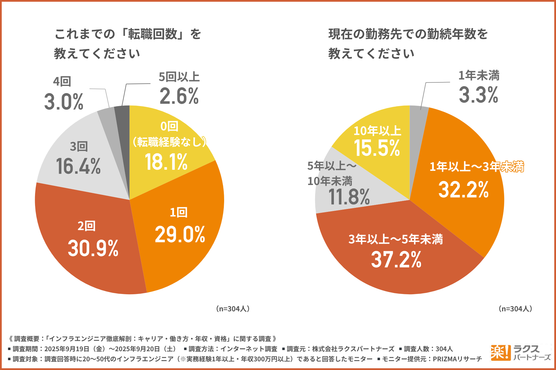 一方、転職経験なしと回答した方も一定数おり、インフラエンジニアという職種の特性上、長期案件や継続運用に関わる中で、同じ職場で腰を据えてキャリアを築く選択をしていると考えられます。