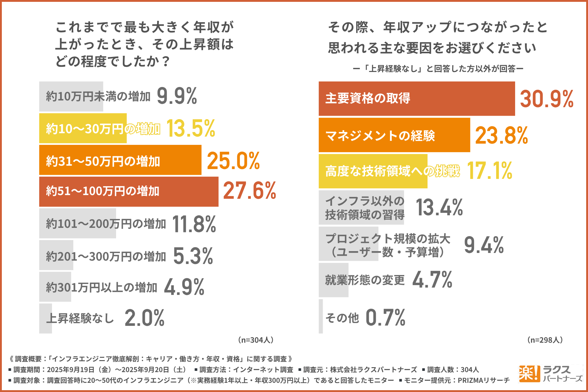 続く「マネジメント経験」や「高度な技術領域への挑戦」からは、チームマネジメント力や先端インフラ技術への対応力といった上位スキルの獲得が年収アップに影響することが明らかになりました。