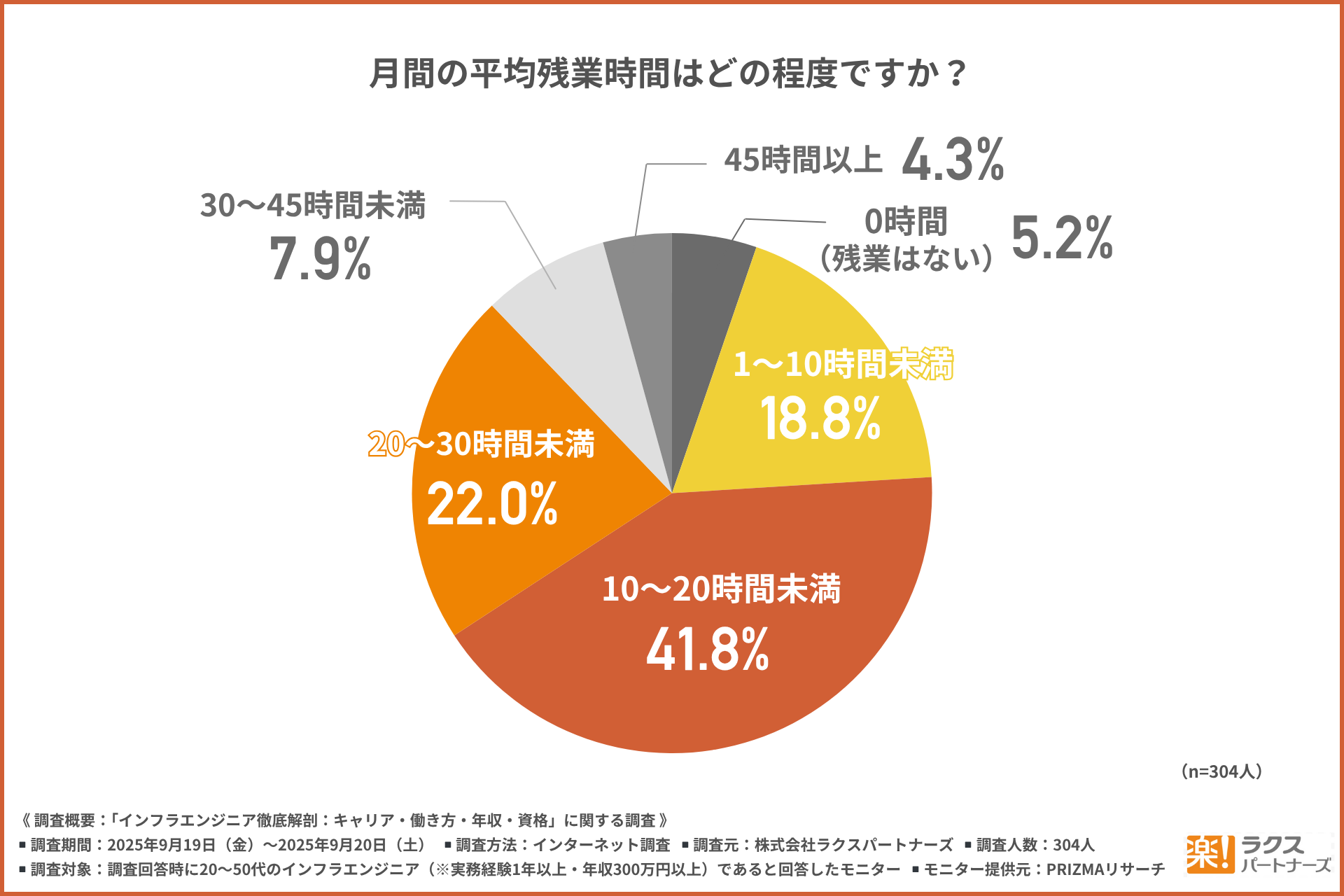 約4割が「月10~20時間未満」と回答し、極端な残業はない様子がうかがえます。