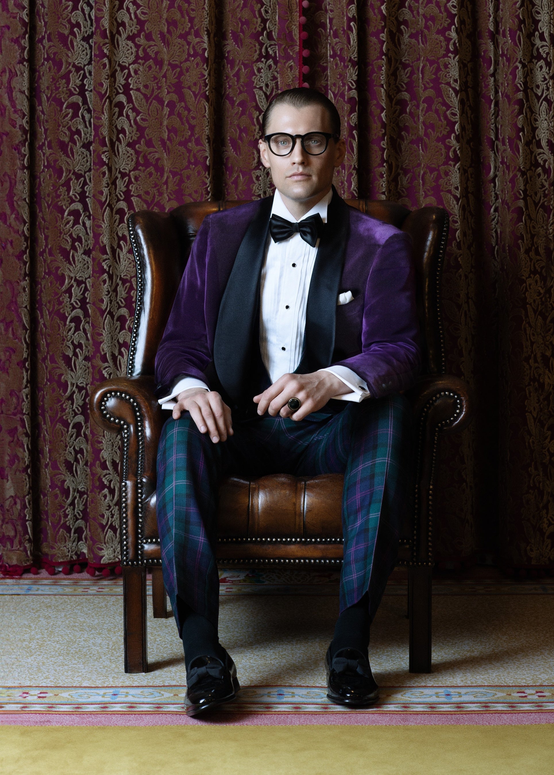 深く濃密なアメジスト色の服地と、端正なシルエットが、今宵の主人公に究極のエレガンスを