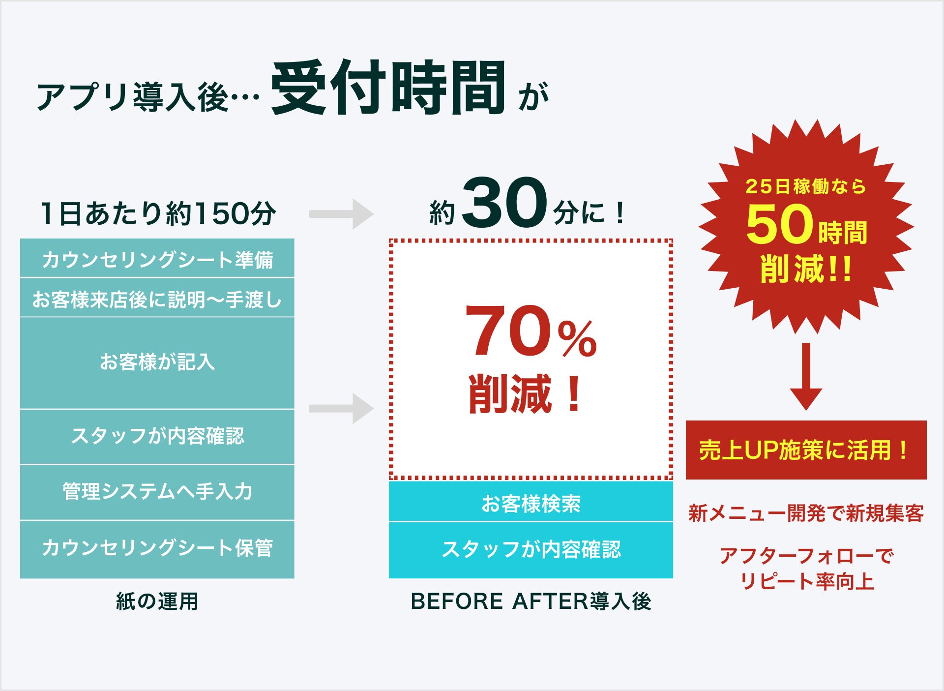 エステサロン・ネイルサロン・整体院などでは、来店時に紙のカウンセリングシートを記入し、その後スタッフがシステムに転記する「二重の手間」が発生していることが課題でした。