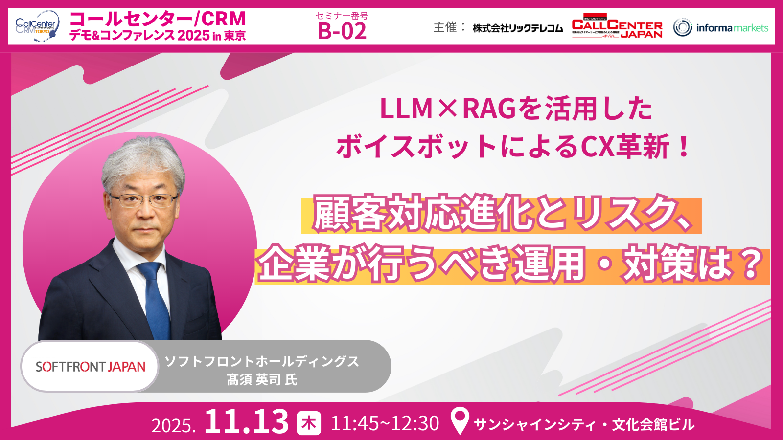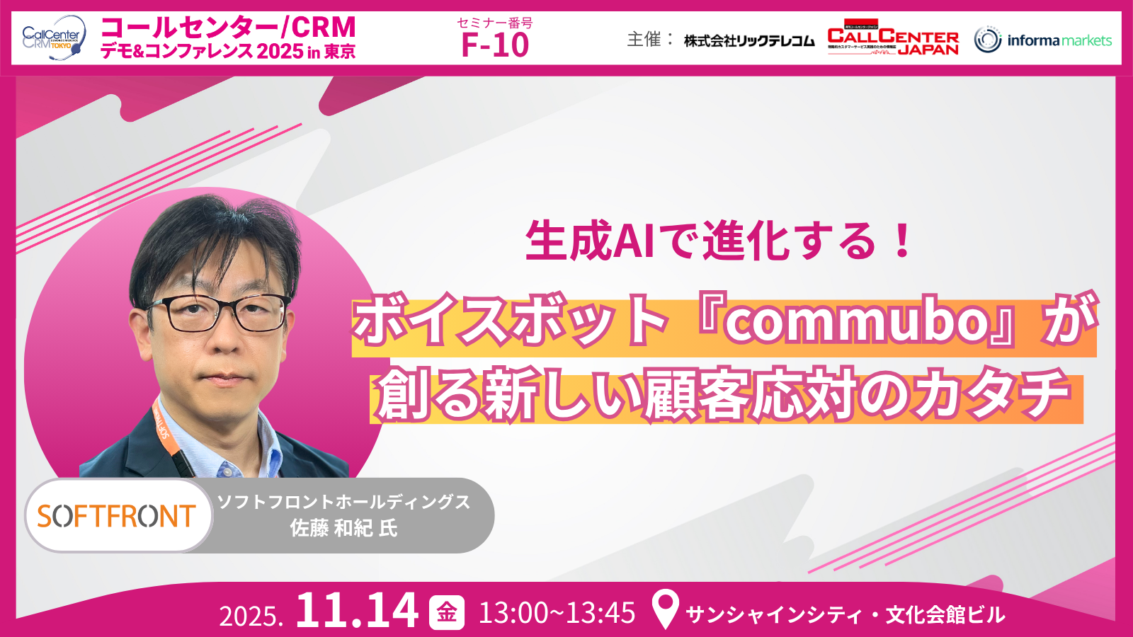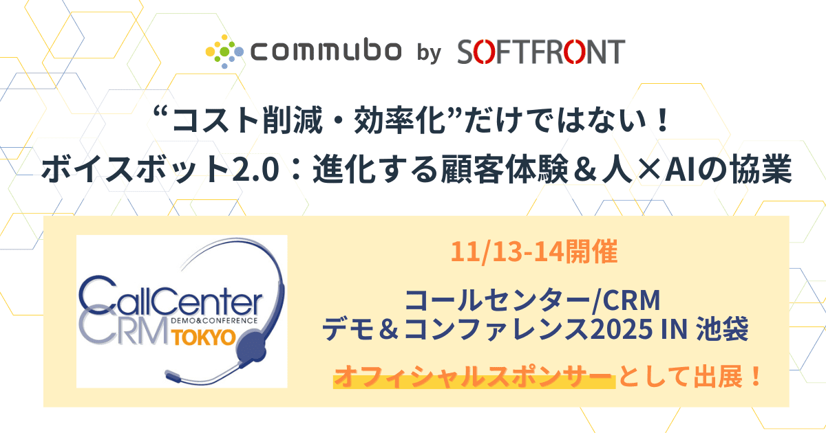 株式会社ソフトフロントホールディングス(本社:東京都千代田区、代表取締役社長:二通 宏久、以下 ソフトフロントホールディングス)ならびに、子会社である株式会社ソフトフロントジャパン(本社:東京都千代田区、代表取締役社長:高須 英司、以下 ソフトフロントジャパン)は、2025年11月13日(木)・14日(金)に開催される『コールセンター/CRM デモ&コンファレンス 2025 in 東京』にオフィシャルスポンサーとして出展します。