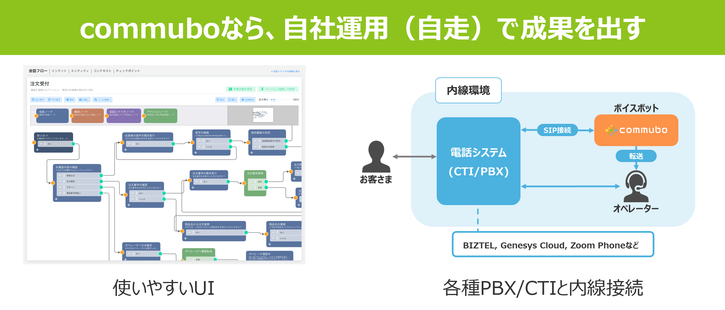 「commubo」は「継続的で」「複雑な」音声の会話に対応する自然会話AIボイスボットです。