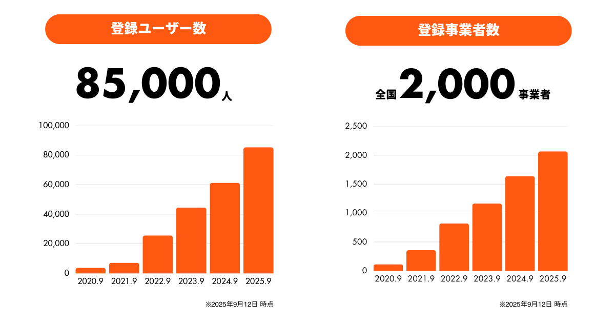 「おてつたび」は、観光地の人手不足を解消すると同時に、旅行者が旅先で働きながら収入を得て、地域と深く交流できる新しい旅のスタイルとして注目いただいております。2021年に5,000人だった登録者数は、2025年9月現在で85,000人に増加しています。登録事業者数は2,000件を突破し、ホテルや旅館などの宿泊業や、農業・漁業などの一次産業が中心ですが、最近ではゲストハウス、キャンプ場、酒造会社、水産加工、飲食店など、多様な業種に広がっています。
