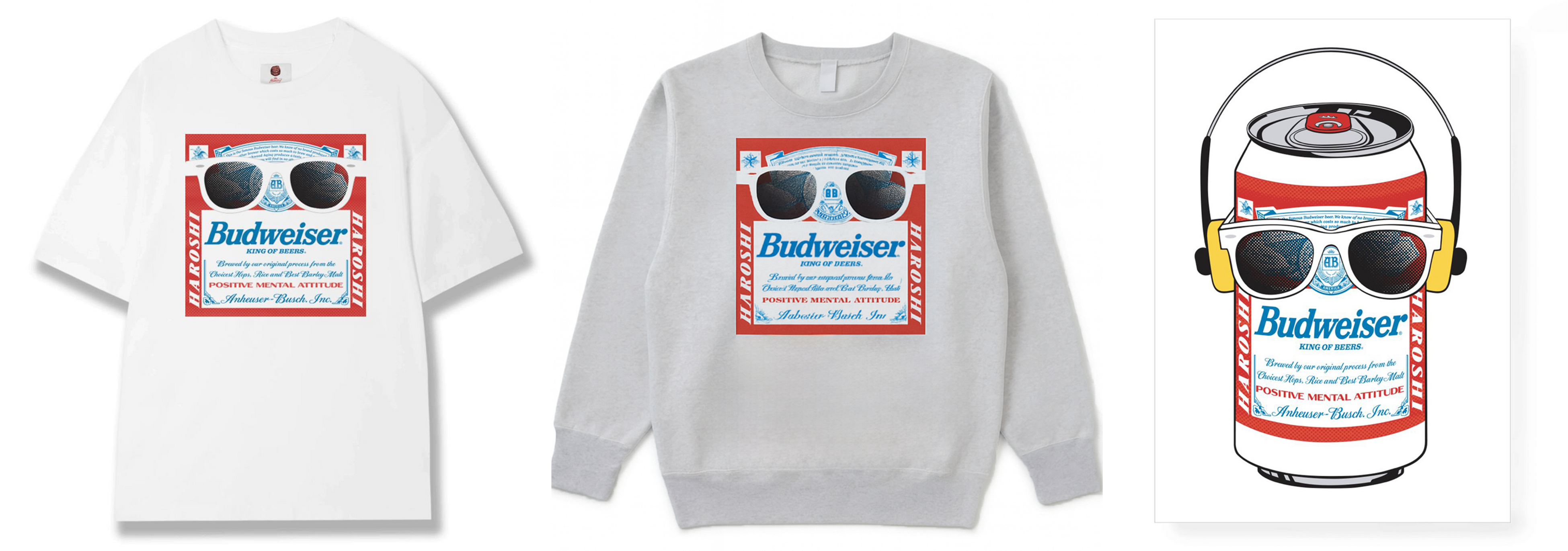 左:Budweiser×HAROSHIコラボレーションTシャツ、中:Budweiser×HAROSHIコラボレーションスウェット、右:「HAROSHICAN」ポスター(A2)