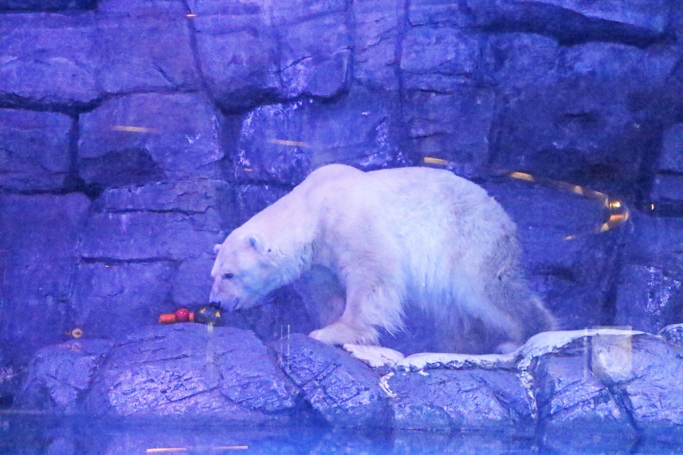 水族館「アクアミュージアム」1階LABO4「氷の海にくらす動物たち」では、ホッキョクグマ、セイウチ、ペンギンといった寒い地域にくらす生きものたちの生態について解説する「極地動物のレクチャータイム」を開催しております。期間中は、食欲をテーマに自然界での食性や捕食方法などを飼育員が解説いたします。また、10月18日(土)~31日(金)内の特定日限定でホッキョクグマにジャック・オー・ランタンに見立てたカボチャをプレゼントいたします。