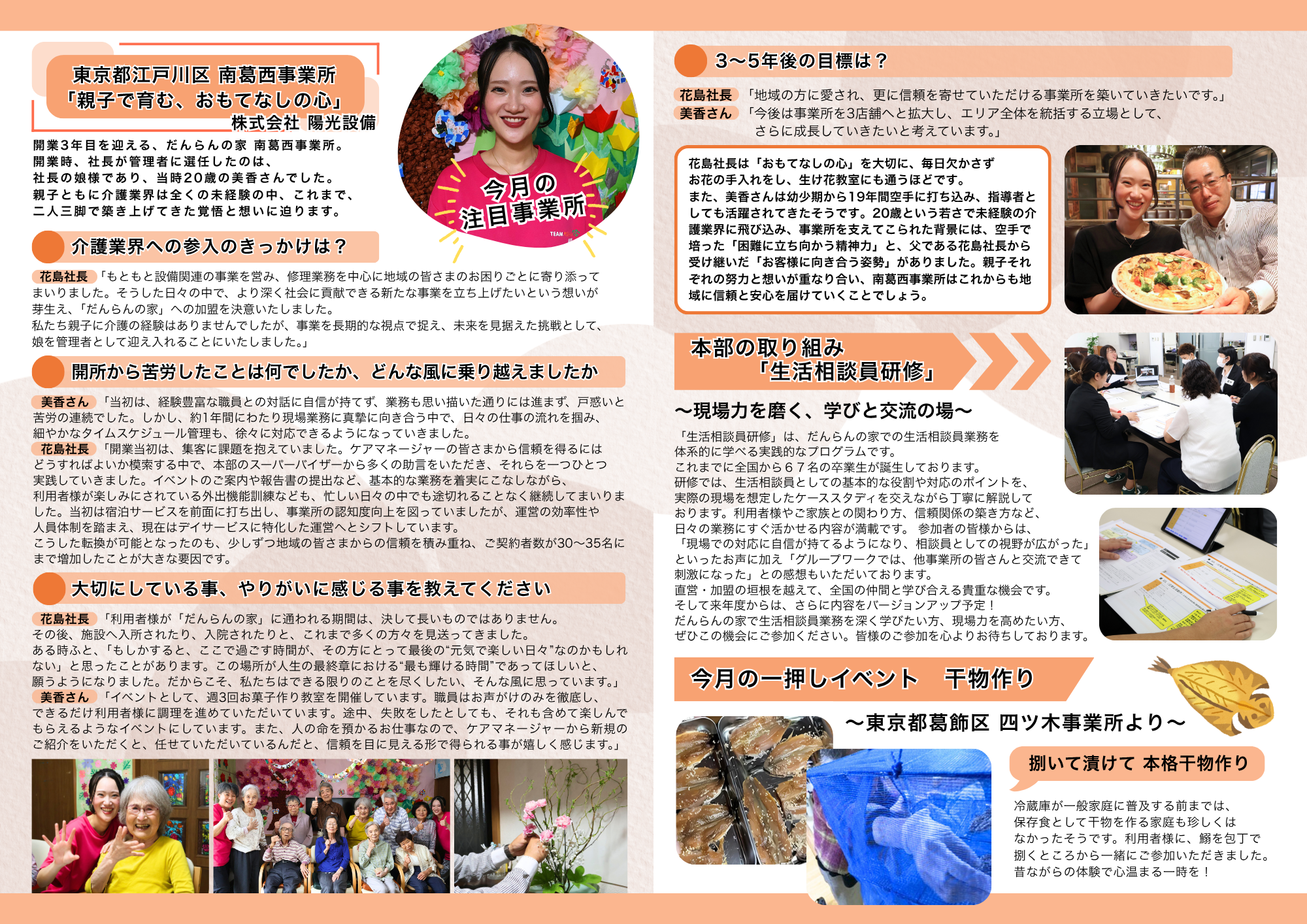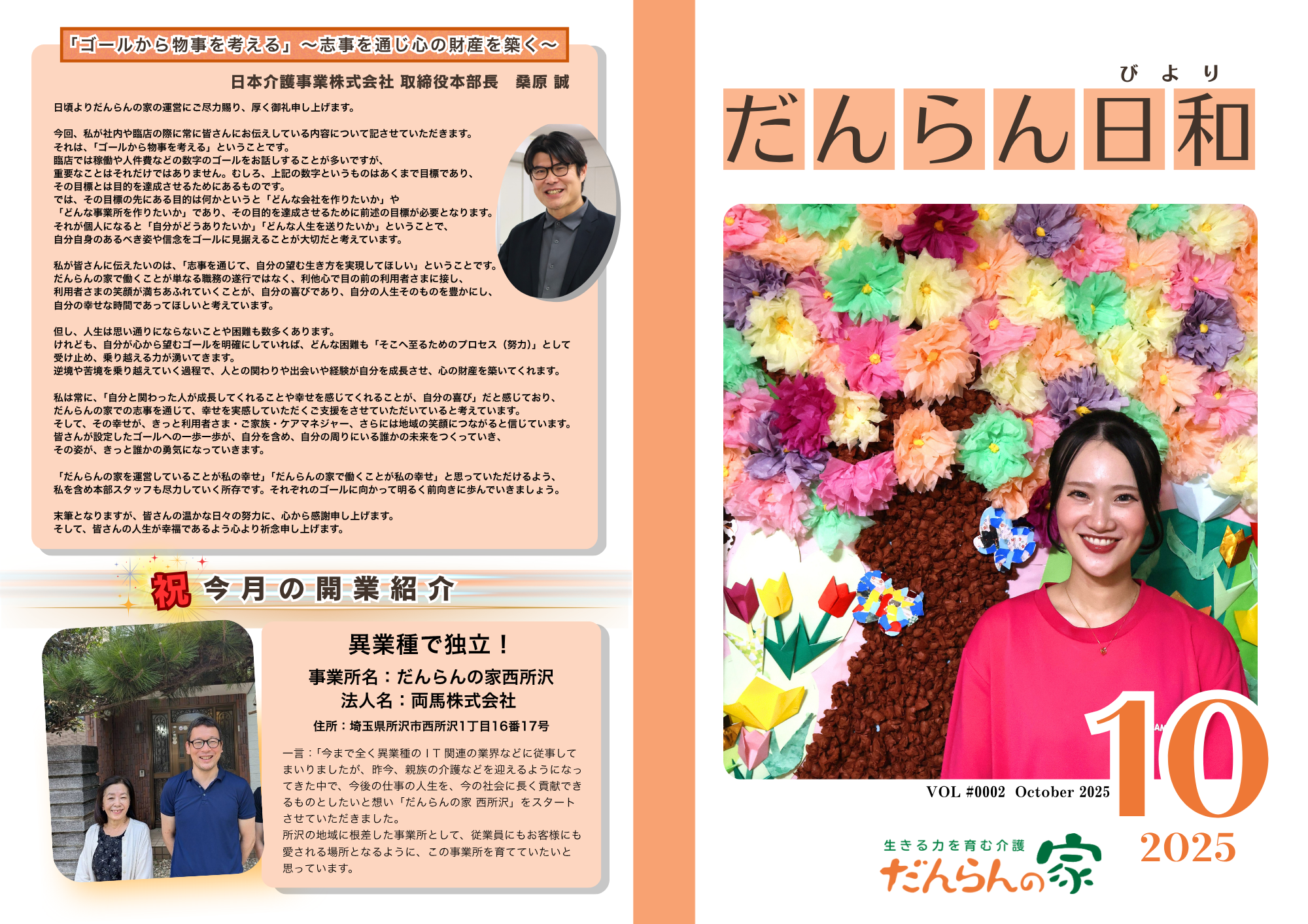 日本介護事業株式会社(本社:/以下、日本介護事業)は、フランチャイズブランド「だんらんの家」の公式月刊広報誌『だんらん日和(びより)』10月号を公開しました。