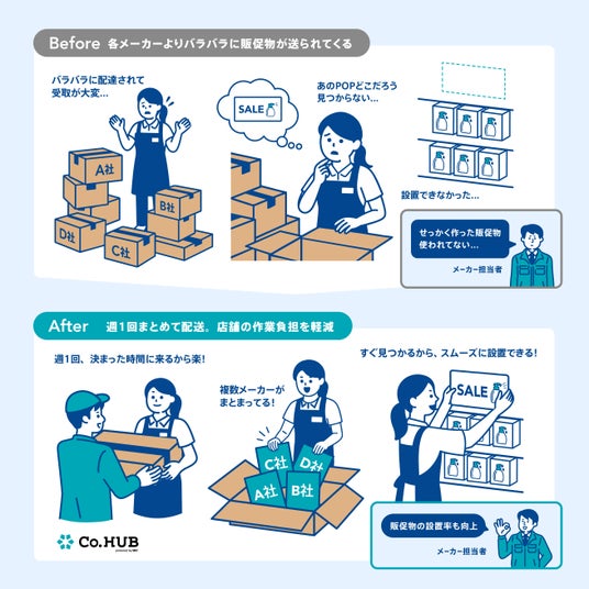 小売店とメーカーを対象とした販促物の共同配送サービス「Co.HUB」は、店舗負担の軽減、物流効率化やCO2削減、販促物の使用率向上を実現し、リリースから2年半でドラッグストアの約半数に導入されています