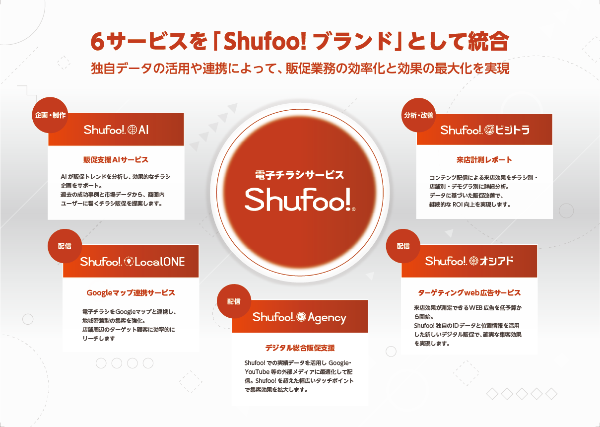 当社では、2001年より電子チラシサービス「Shufoo!」を中心に、小売流通企業の多様なニーズにお応えするため、「LocalONE」「リテールマーケティングサービス」「ビジットトラッキング」など、専門性の高い複数のサービスを順次展開してきました。これら多様なサービスをShufoo!カラーであるShufoo!レッドで統一し、各サービス間の関連性や相乗効果をさらに明確にすることで、利便性を高めお客様にとってより分かりやすく、かつ包括的な販促ソリューションの提供を実現してまいります。この統合を機に、Shufoo!ブランドは真のリテール販促パートナーとして次のステージに進み、社会にイノベーションをもたらす新たな挑戦を開始いたします。