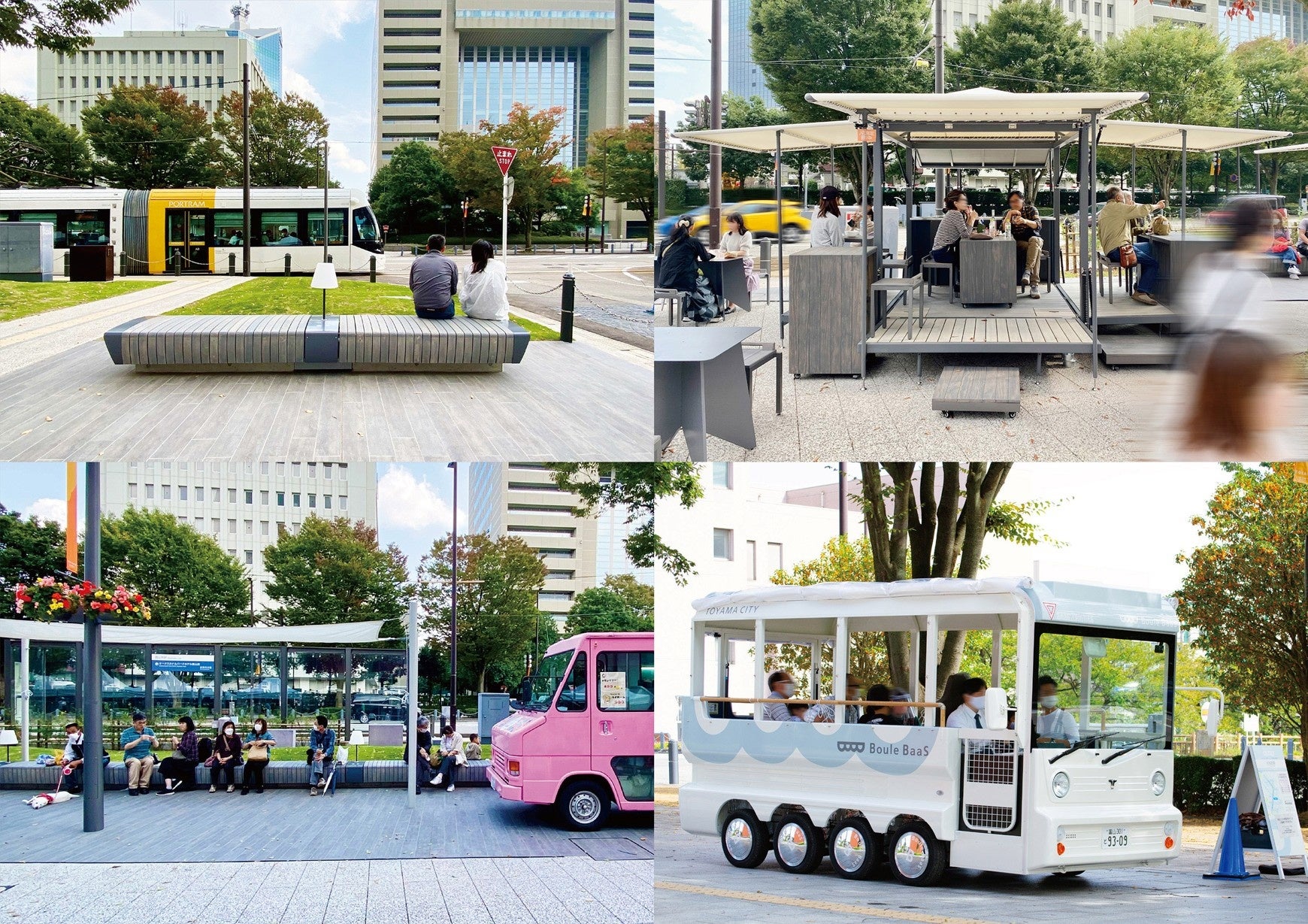 コンパクトで歩いて暮らせるまちづくりを推進する富山市の、着実な歩みと、時代や場所に応じた手法の選び方には、目を見張るものがある。南北LRTの接続を経て、駅北から富岩運河環水公園までのブールバール広場を再整備することで、賑わいの隔たりを繋いでいくのが本取り組みである。舗装や植栽で道路の高質化を図るとともに、ファニチャなどは常設にこだわらない軽やかなデザインで条例やエリマネと組み合わせて実現されている。商業の中心である駅南側市街地とは異なる考え方が採用されるとともに、現代的な整備の考え方でもある。歩道幅員の広さを活かしてグリーンスローモビリティを導入していることもユニークで、日本初の本格的LRTとして2006年に開業した富山ライトレールに対して、思い切って遅い交通を導入しているなど、位置づけが明確である。これからも、交通とまちと仕組みのデザインで地方都市をリードしてくれることを期待したい。