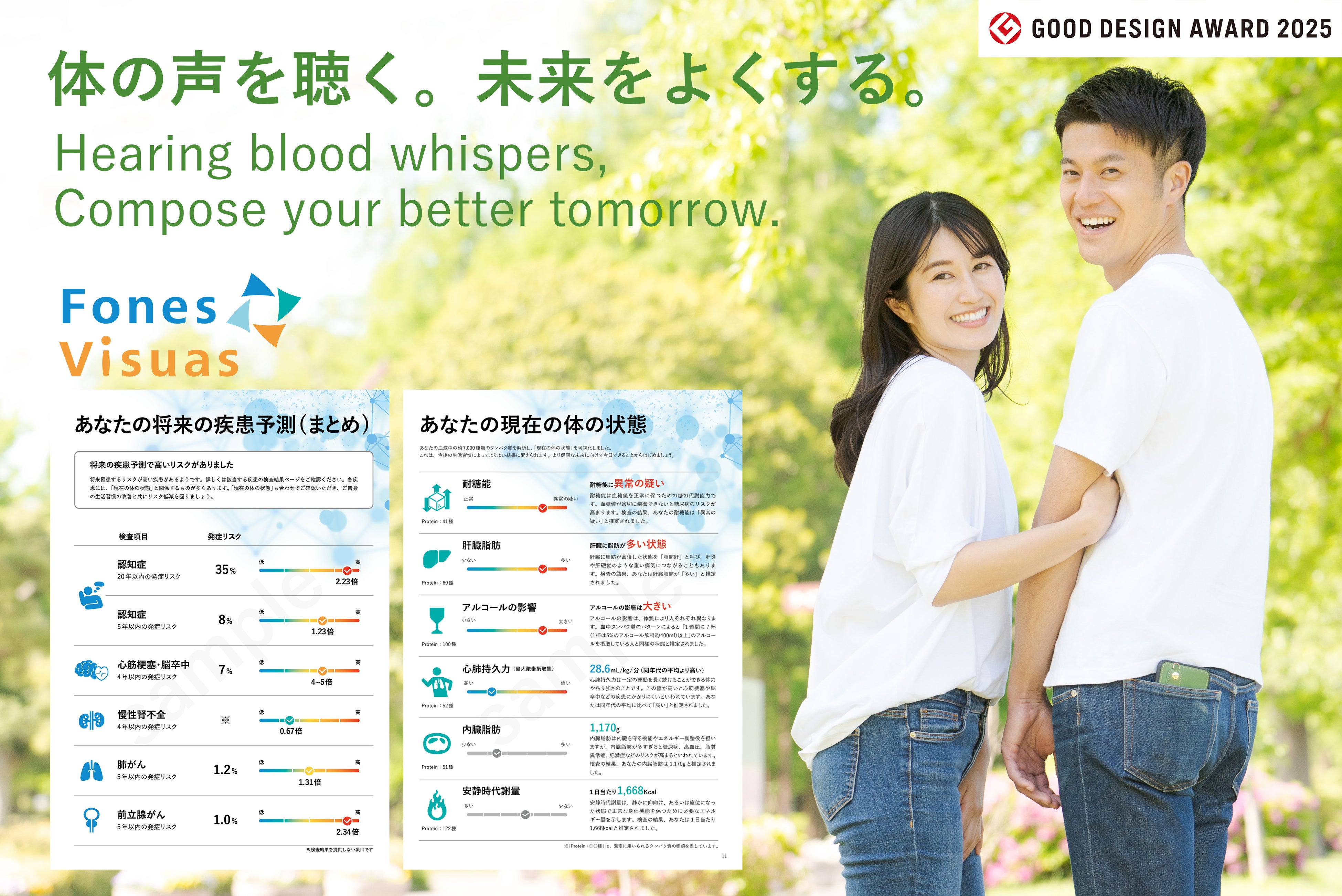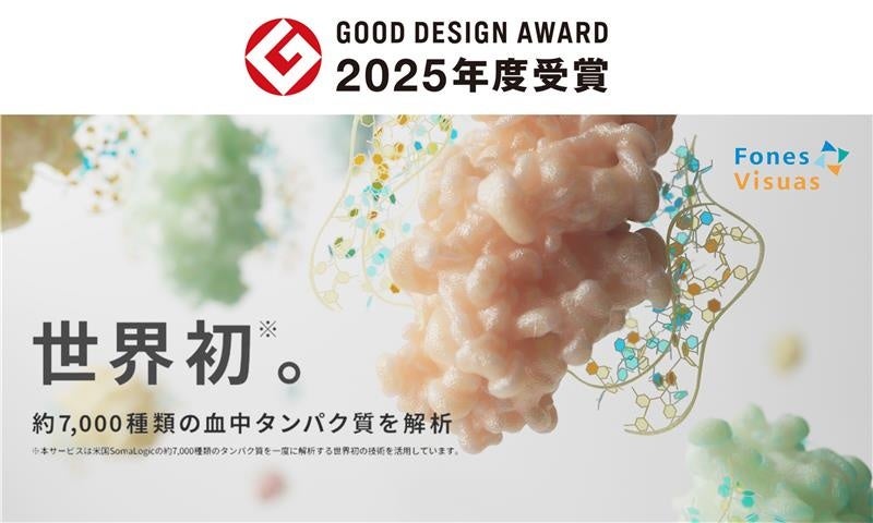 少量の血液(注1)から約7,000種類のタンパク質を一度に解析する世界初(注2)の技術を活用し、「将来の疾病リスク」と「現在の体の状態」を可視化する疾病リスク予測検査「フォーネスビジュアス」(注3)が、暮らしや社会をよりよくしていくデザインに対して与えられる「2025年度グッドデザイン賞(主催:公益財団法人日本デザイン振興会)」を受賞しました。