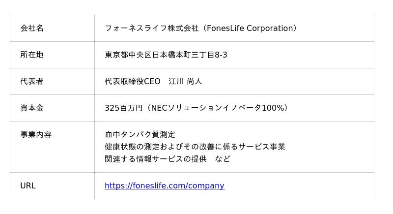 フォーネスライフは、NECグループのヘルスケア事業を担うNECソリューションイノベータが100%出資する会社です 。米国 SomaLogic社の血中タンパク質測定技術と、NECグループのビッグデータ解析・先端ICTを用い、認知症などの将来の疾病リスク予測に基づく、一人ひとりに適した生活習慣の改善提案を行うことで、“誰も病気にならない未来”、“誰もが自分らしく生きられる社会”の実現を目指しています。