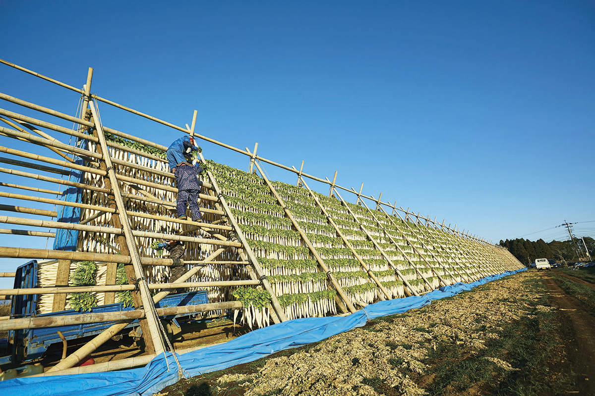 製法は、原料の大根を一本一本やぐらにかけて冬の寒風にさらし、自然乾燥させる伝統的な製法を守り続けています。漬け込みには、家庭にあるような調味料(米ぬかと天日塩、とうがらし)を中心に、シンプルな原材料を使用しています。