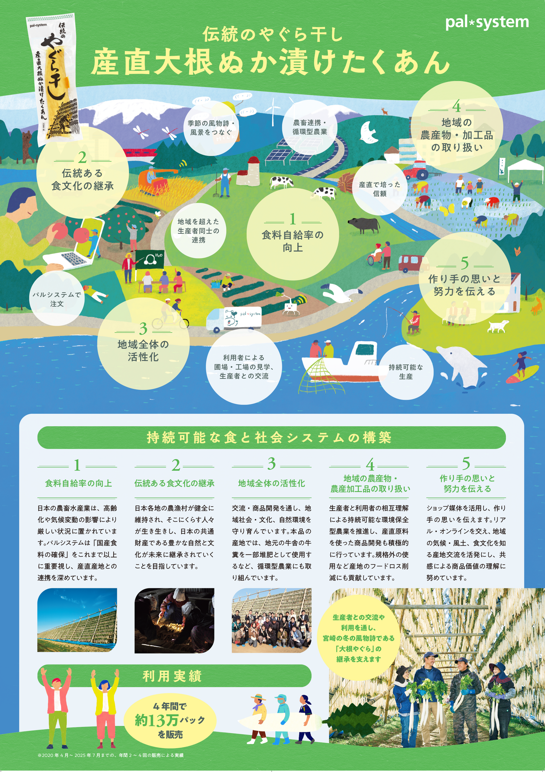 パルシステムは、安全・安心な食を大切にし、産地と消費者を顔の見える関係で結ぶ「産直」を理念に掲げています。組合員一人ひとりの日々のくらしが、生産者支援や地域活性化につながる、持続可能な社会づくりを目指しています。
