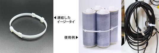 繰り返し使え、連結もできる結束バンドです。取り付けた後も長さを調節でき、不要な部分はまとめられるため、ニッパーやハサミなどの道具を必要としません。複数のイージータイを連結して任意の長さにできるため、対象に応じた長さのバンドを用意する必要がなく、1種類で多様な長さに対応できます。