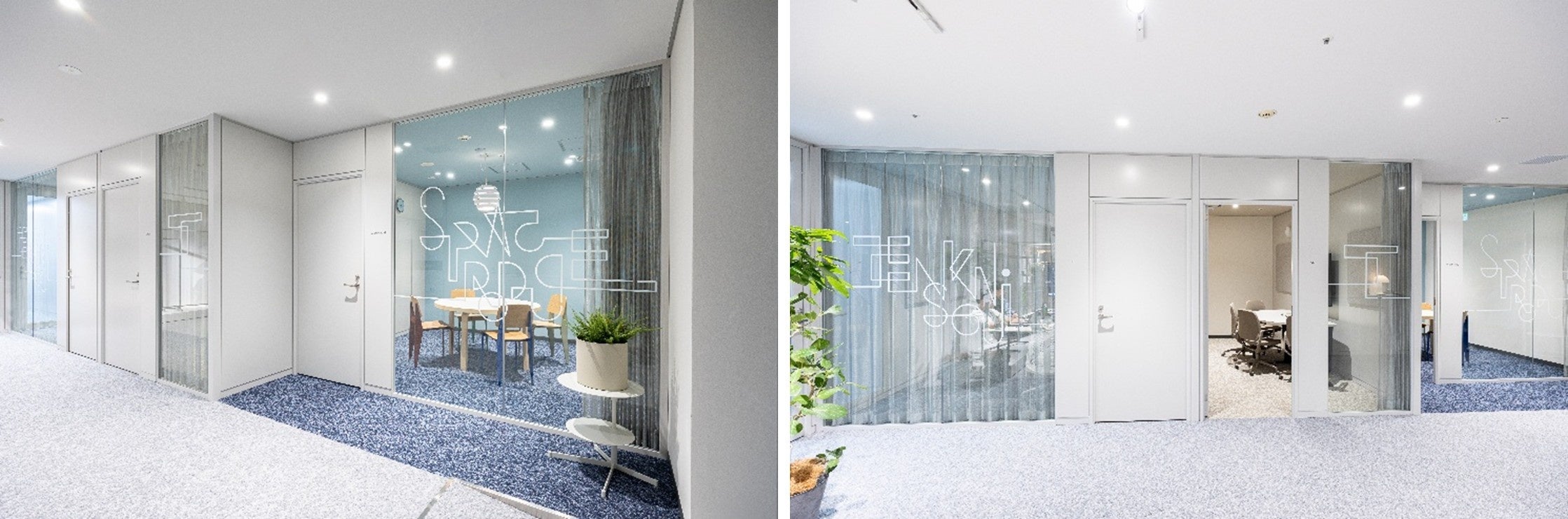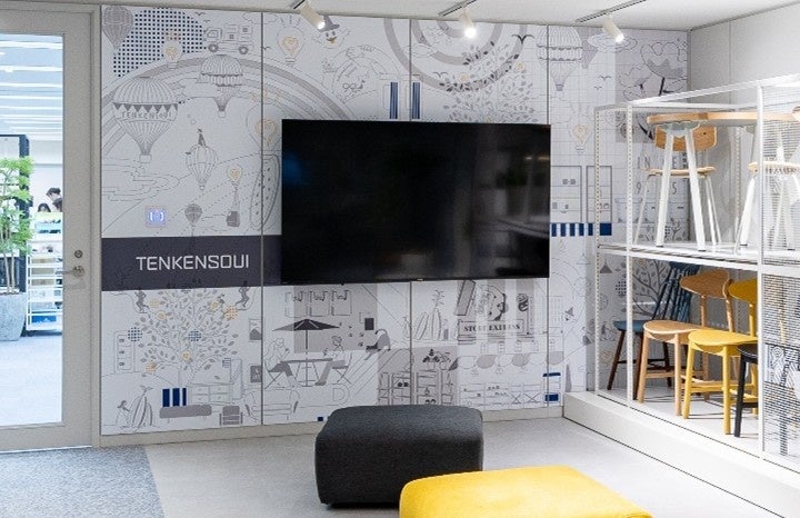 新オフィスは、延床面積約580平方メートル (約175坪)と旧オフィスから1.5倍拡大し、75~80席を配置しています。会議室は、当社主力となる店舗什器の商品名を冠した5室を設け、ミーティングエリアを4区画確保しました。自席以外で集中作業ができる個人用ブースや完全個室ブースを新設し、用途別ゾーニングで構成。休憩・打ち合わせ・イベント利用が可能な「Lounge」には大型モニターを設置し、大阪本社や全国拠点とのオンラインコミュニケーションツールとしても活用します。エントランス兼エキシビジョンエリアでは、企業ビジョンを表現した大画面グラフィックをダイナミックに掲出しながら、その時々の新商品やプロモーション商品を展示し、社外ブランディングと情報発信の拠点とします。執務エリアでは当社オリジナル家具や100%子会社の家具ブランド「ENEN(エネン)」の製品を配し、多様な働き方を支える快適な動線とデザイン性を両立。社員のエンゲージメント向上と創造性の醸成を図ります。