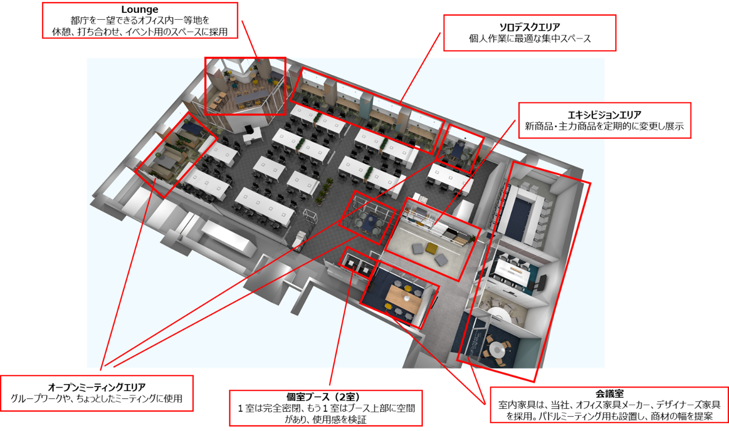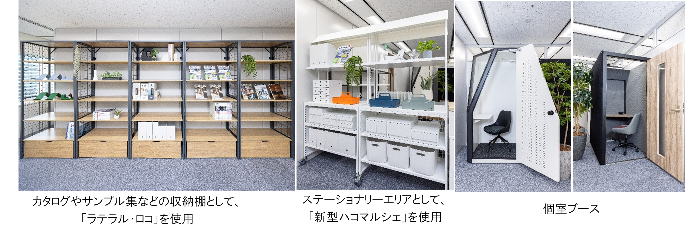 当社オリジナルの什器やオフィス家具の使用イメージを提案する、ショールーム型オフィスへ
