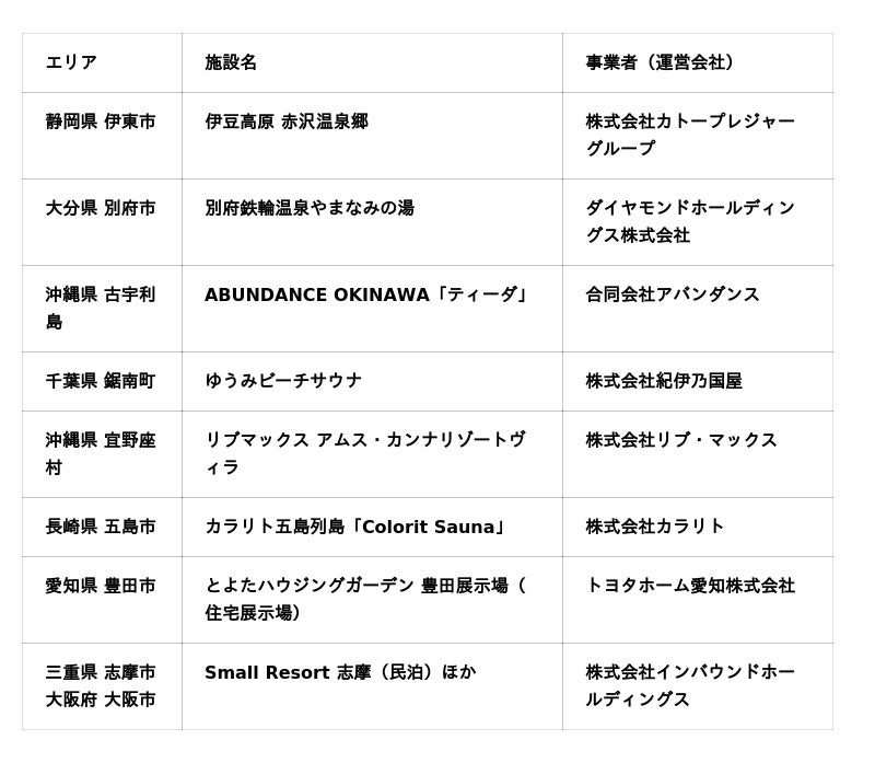国内有数のリゾート運営会社・カトープレジャーグループへの採用は、kokolo sauna(R)製品の「品質」「安全性」「集客力」を証明するものです。