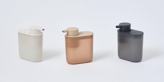 優しい透け感でソープの残量がさりげなくわかる。ポンプを回すと縦置き・横置きに対応する柔軟なデザインで、水周りのスペースをすっきりと整える。柔らかなフォルムとこだわった使い心地・質感は、手洗い時の心地良いひとときを作り出す。