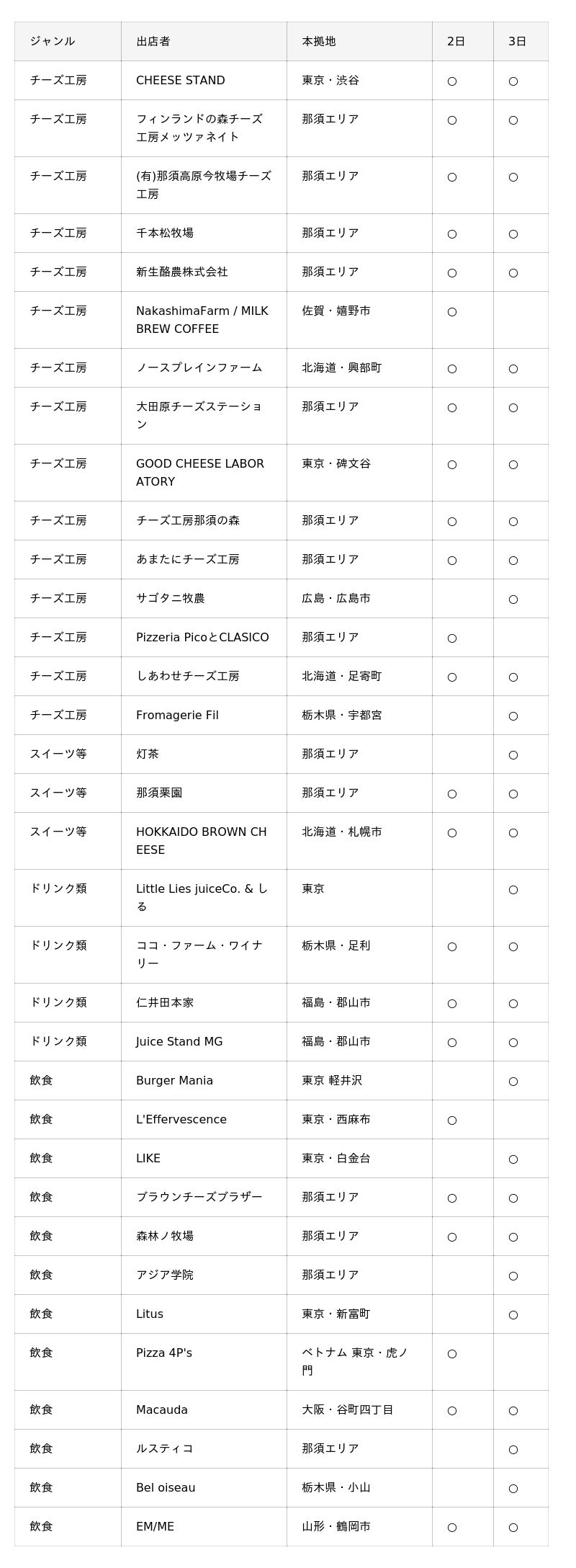 あまたにチーズ工房、大田原チーズステーション、GOOD CHEESE LABORATORY、しあわせチーズ工房、新生酪農株式会社、千本松牧場、チーズ工房那須の森、CHEESE STAND、(有)那須高原今牧場チーズ工房、ノースプレインファーム、フィンランドの森チーズ工房メッツァネイト