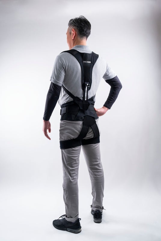 労働現場における従業員のあらゆる作業時の腰への負担を軽減する“腰サポーター”一体型アシストスーツ。従来モデルの使用者から頂いた機能性・快適性向上に対する要望に応え、「太ももベルトから肩ベルトまで直結する構造」と「パーツの配置変更」の2点をリニューアル。快適な装着感と前傾・中腰姿勢・立位時の腰部への負担軽減を実現した。