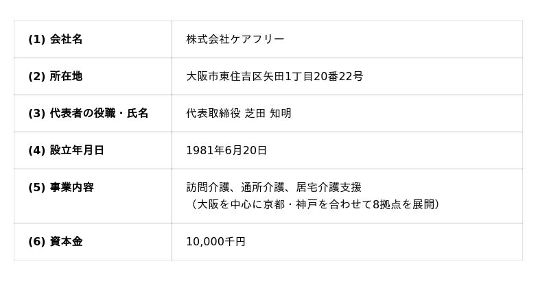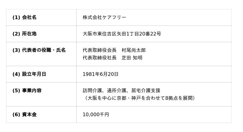 ケアフリーは、1981年の創業以来、訪問介護、通所介護、重度訪問介護、及び居宅介護支援をコア事業として、大阪・京都・神戸の関西都市圏において地域に根差した質の高いサービスを展開してまいりました。