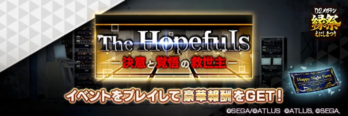 ランキングイベント“The Hopefuls -決意と覚悟の救世主-”では、期間中に『真・女神転生IV』の雰囲気が味わえるイベントオリジナルのストーリーを楽しめるほか、イベントクエスト等で手に入る「パーティ招待券」を集めることで、「フリンの超越石」や「変華の匙水」、「縁祭記念召喚札」などの豪華報酬を獲得できます。